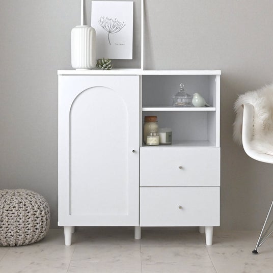 今回お届けするのはマントルピースのようなデザインが特徴のキャビネットです。曲線と直線の絶妙なバランスが心地よく、収納力もたっぷり。日用品など生活感のあるものも、おしゃれにすっきりと収められます。
