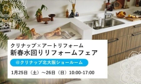 全国でリフォーム・リノベーション工事を年間6,500件以上手がける株式会社アートリフォーム(本社:大阪府吹田市、代表者:代表取締役社長 大本哲也、以下「アートリフォーム」)は、2025年1月25日(土)~26日(日)にかけて、クリナップ北大阪ショールーム(大阪府箕面市)にて<クリナップ×アートリフォーム 新春水回りリフォームフェア>を開催致します。