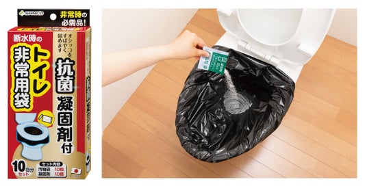 ●断水時の洋式便器に市販のゴミ袋(45L)をかぶせるだけで、用を足すことができます。