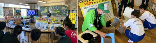 蓮田市立黒浜西中学校で行われた第7回黒西中「防災キャンプ」に参加し、災害時のトイレの重要性と簡易トイレの組立方法を、生徒に向けてレクチャーいたしました