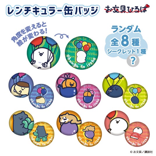 レンチキュラー缶バッジ 全8種:各693円(税込)写真を撮るたびにお文具さんたちの姿が変わる!?カバンにつけていっしょにお出かけしよう!