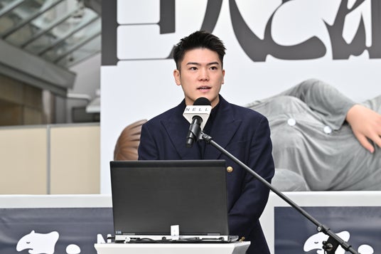 発表会では、はじめに「NELL(ネル)」を提供する株式会社Morghtの土井皓貴代表取締役が登壇し、「NELL マットレスは、業界最多水準のポケットコイルを搭載したポケットコイルマットレスです。我々は、添い寝によって生じる睡眠課題を『添い寝シンドローム』と名付け、本イベント「巨人と添い寝展 by NELL」を開催するに至りました。イベントに先立って実施した調査ではポケットコイルマットレスを使っている人は比較的睡眠に課題を感じていないという結果が明らかになり、より多くの方にポケットコイルマットレスをお届けしなければいけないと強く感じました。本イベントを通して、ポケットコイルマットレスの良さを体験していただき、睡眠について考えていただくきっかけになればと思っております。」と、本イベントの開催に至った想いを話しました。