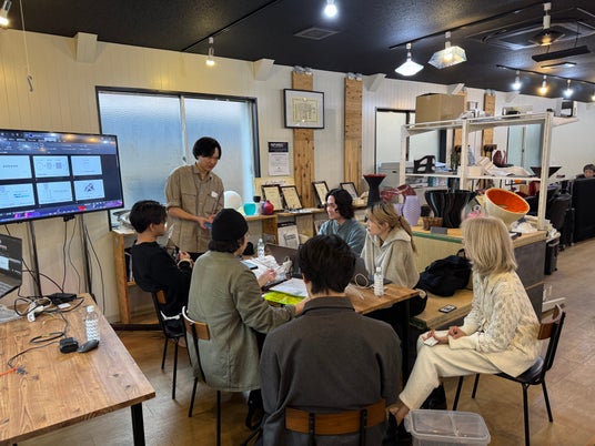 プロジェクトのキックオフのときに来社されたデザイン担当の影山先生(左)、SyncMOFの堀氏(右から2番目)