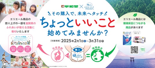 衛生用紙製品 No.1ブランド※1の「エリエール」を展開する大王製紙株式会社(本社:東京都千代田区、代表取締役社長:若林 賴房)は、からだとこころの触れ合いによって幸せと笑顔を増やす「エリエール えがおにタッチPROJECT」を実施しています。このたび、同プロジェクトの一環として、プロジェクトに賛同いただいた株式会社平和堂(本社:滋賀県彦根市、代表取締役社長執行役員CEO:平松 正嗣)と協同で、第3弾となる「ちょっといいことキャンペーン」を実施しました。同社とは2023年4月から継続してキャンペーンを実施しており、期間中の売り上げの一部を滋賀県と滋賀県社会福祉協議会が協働で子どもを真ん中においた地域づくりをすすめる「子どもの笑顔はぐくみプロジェクト」に寄付します。