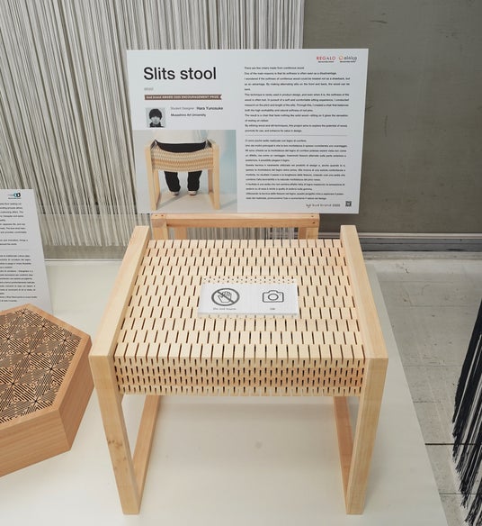 REGALO株式会社は「Slits stool」(原 優ノ介さん:武蔵野美術大学)の作品を企業賞として選出いただきました。