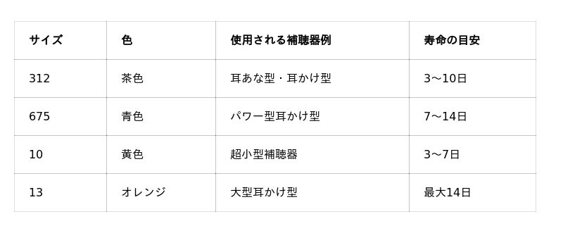 – サイズ10(黄色):小型補聴器に使用され、寿命は短め