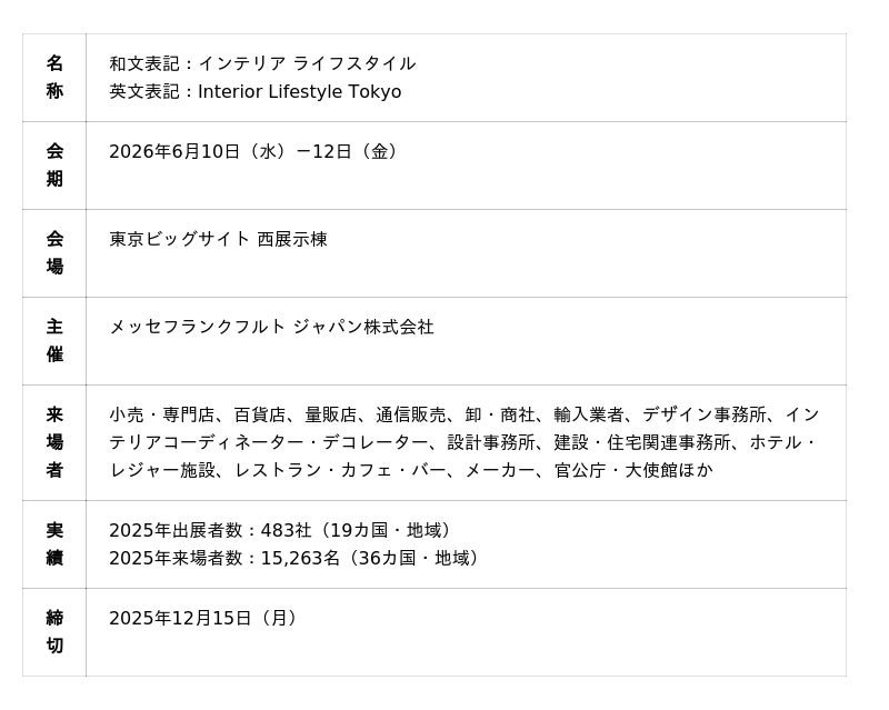 メッセフランクフルト ジャパン株式会社(代表取締役社長:梶原靖志)は、ライフスタイル提案型の国際見本市「インテリア ライフスタイル」を2026年6月10日(水)―12日(金)の3日間、東京ビッグサイト 西展示棟にて開催します。本見本市は、インテリアからファッション雑貨、キッチン・ダイニングアイテムなど、衣・食・住に関わる幅広い商材を紹介する商談見本市として、また、国内外の消費財メーカーやデザイナーが自らの世界観を表現できる場として活用されてきました。出展者からは「異業種の来場者との出会いが新しい販路につながった」「ブランドの方向性に確信を持つきっかけになった」との声が寄せられており、単なる商談の場だけでなく、新たな可能性を生む機会としても評価されています。