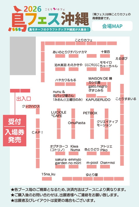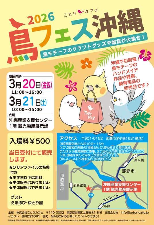 「小鳥たちを眺めながら、まったりコーヒータイム♪」をコンセプトにした「ことりカフェ上野本店」(http://kotoricafe.jp/)を運営する株式会社ことりカフェ(本社:東京都台東区 代表取締役 川部志穂)は、2026年3月20日(金祝)・3月21(土)に、那覇空港から車で10分の好アクセスの「沖縄産業支援センター」(那覇市字小禄1831番地1 https://www.okinawa-sangyoushien.co.jp/access/) 1階 観光物産展示場にて、“鳥好きによる鳥好きのためのフェスタ”第1回「鳥フェス沖縄2026」(主催:ことりカフェ)を開催いたします。全国から人気クリエイターが集合し、色とりどりの小鳥モチーフの作品を対面販売。CAP!(ドリームバード)による小鳥のご飯や飼育用品も販売しますので愛鳥さんのお土産選びもご満足いただけます。