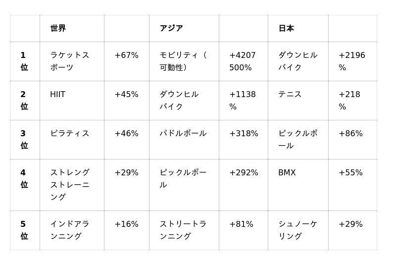 2025年、全世界のGarminユーザーが記録したアクティビティ総数は前年比で8%増加しました。世界・アジア・日本で特に大きく伸びたアクティビティの上位5位は以下の通りです。