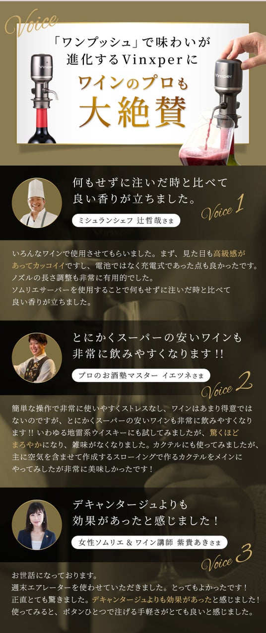 「Vinxper expert」が登場し、自宅で簡単にソムリエの技術を再現できる時代がやってきました。シンプルな操作と最先端の技術で、どなたでも本格的なワイン体験を楽しめます。