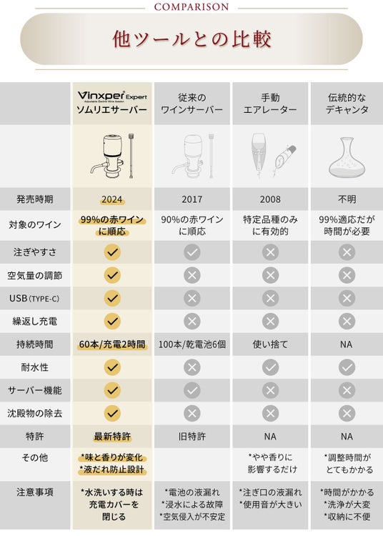 若い赤ワインから熟成ワインまで99%の赤ワインに対応しているからこそ、自宅にあるワインですぐに違いが実感できます!