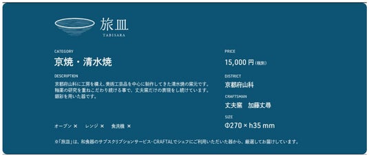 旅皿プロジェクトは「物語のある、お皿たち」をコンセプトとした伝統的工芸品の二次流通事業で、株式会社Culture Generation Japan(東京都中央区 代表取締役 堀田 卓哉)が運営する和食器のサブスクリプションサービス「CRAFTAL」で使用した“日本全国の窯元や陶芸作家の上質な作品”を再び流通させる新しい取り組みです。