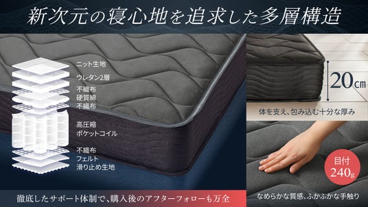 身体を支え、包み込む厚さ20cmが新次元の寝心地を実現します。コイルとウレタンを組み合わせた多層構造により、底つき感がなく贅沢な寝心地を提供。まるで雲の上のように包み込まれるような寝心地を作り出します。