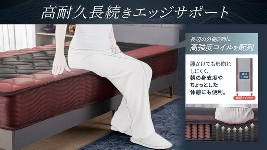 型崩れしやすい外周部分に線径2.0mmの高強度コイルを採用し、耐久性を向上。座る際にも滑り落ちることなく、朝の身支度やちょっとした休憩にも便利です。両サイドを強化したコイル設計により、2台並べても中央で沈み込むことなく、1台でも端まで広々と使用できます。日常の使いやすさと快適さを両立させた、優れた設計です。