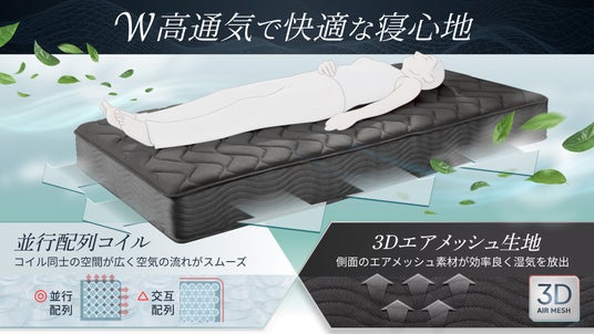 ポケットコイルの並行配列が空気の通り道を確保し、優れた通気性を実現。ムレを軽減し、いつでも快適で爽やかな寝心地を提供します。側面には3Dエアメッシュカバーを採用し、湿気や熱を効率よく排出して快適な眠りをサポート。さらに、清潔さを保つ設計で、一年中気持ちの良い寝心地を提供します。