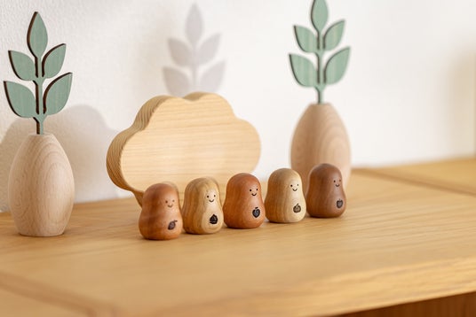 毎回大人気の「願い小だるまレンジャー」。今回はなんと全てフルーツの木から削り出された五人衆です!