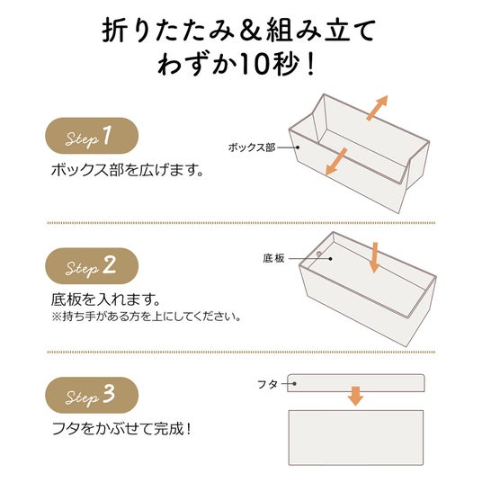 スツール・オットマンとしてちょい座りに、収納ボックスとして身の回りの整理整頓に使える機能性抜群の商品です。組み立てはわずか10秒の3ステップで完了するため、初心者でも簡単に組み立てることができます。面倒な工具や時間をかけずに、すぐに快適な座り心地を楽しめるため、忙しい方にもぴったりです。