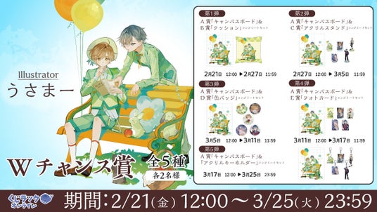 カルチュア・エンタテインメント株式会社は、イラストレーター『うさまー』とのコラボを実施いたします。2025年2月21日(金)より『うさまー』のオンラインくじを、「くじラックオンライン」で発売いたします。 さらに、くじ1枚ご購入ごとにWチャンス賞の抽選が行われ、当選した方は特別な賞品が獲得できます。