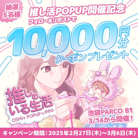 POPUP開催を記念して、eeo Store onlineで使える1万円分クーポンを抽選で5名様にプレゼントいたします! OSHI+とeeo Store onlineの2つのXアカウントをフォローし、キャンペーンポストをリポストすれば応募完了です♪