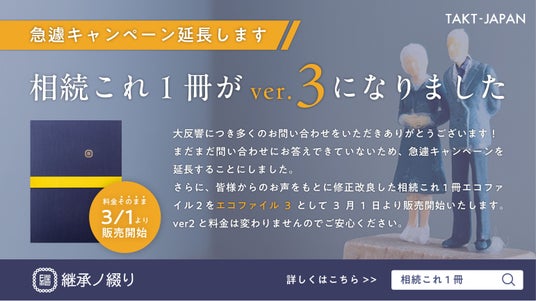 株式会社TAKT-JAPAN(本社:神奈川県横浜市、代表 田代貴祥)は、複雑な相続手続きをこの1冊で簡単に解決できる実践用の相続手続きサポートファイル「相続これ1冊(継承ノ綴り)」(特許取得番号:7174455)は2025年2月28日本日終了のキャンペーンの延長を急遽決定いたしました。この決定は、相続手続きに関するお客様からの多くのご質問とフィードバックを受け、現状の全ての精査及び解決までの期間が完了するまでの間として延長することを決定いたしました。