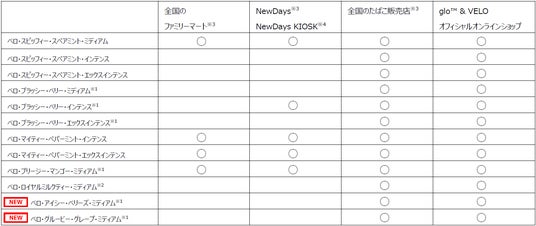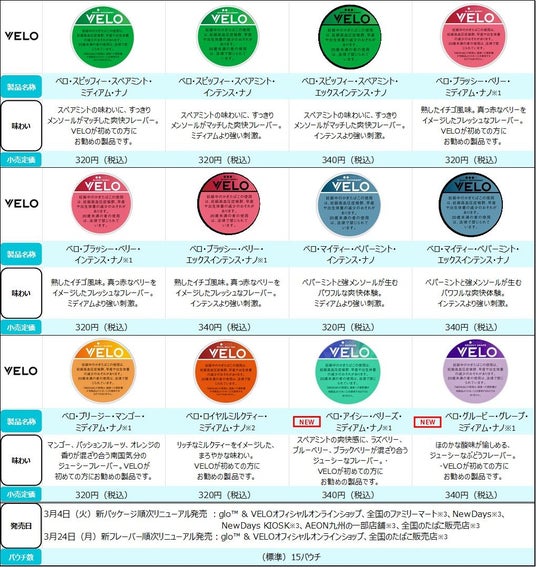 ブリティッシュ・アメリカン・タバコ・ジャパン合同会社(本社:東京都港区、社長:エマ・ディーン、以下「BATジャパン」)は、2025年3月4日(火)より、いつでもどこでも楽しめる新ジャンル・オーラルたばこ「VELO(ベロ)」の販売エリアを拡大します。これまでファミリーマート(※1)での販売は東京都内および福岡市内に限られていましたが、今後は全国のファミリーマート(※1)でも購入できるようになります。また、これに伴い販売中の「VELO」の全ラインナップのパッケージデザインを刷新します。さらに、新たに「ベロ・アイシー・ベリーズ・ミディアム」と「ベロ・グルービー・グレープ・ミディアム」の2つのベリー系フレーバーを、3月24日(月)よりglo(TM) & VELO オフィシャルオンラインショップおよび全国のたばこ販売店(※1)にて発売します。オーラルたばこ製品のラインナップを強化し、ユーザーの多様な嗜好に応えてまいります。
