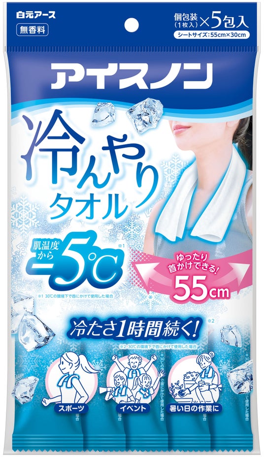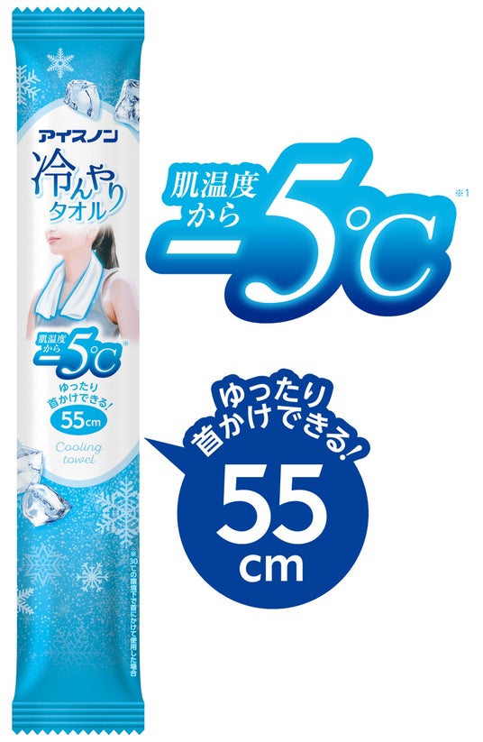 今回発売する『アイスノン 冷んやりタオル』は、首にかけるだけで肌温度から-5℃※1の冷涼感が得られる冷却タオルです。冷感成分トリプル配合※2の冷却液をたっぷり※3含み、ひんやり感が約1時間※4続きます。さらに、ヒアルロン酸、コラーゲンも配合しています。また、無香料で香りが気にならないので、どこでも気軽にご使用いただけます。タオルの長さは55cmあり、ゆったり首にかけることができます。加えて、個包装なので鞄やポーチに入れて持ち運びができ、使いきりタイプで衛生的です。冷凍庫で冷やすとさらに冷たく感じることができるので、暑さが厳しい季節にオススメです。スポーツや屋外イベント、暑い日の作業など様々なシーンでご使用いただけます。