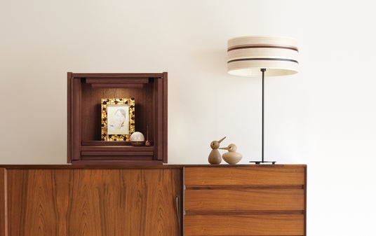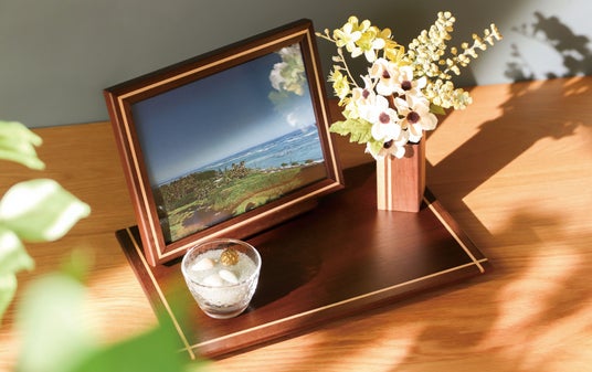 写真立・花立・造花が付属したオープン型のミニ仏壇です。クラフト感あふれる寄せ木細工は、卓越した技術を持つ工房で職人が一つひとつ丁寧に手がけました。写真立はステージに固定することができて、位置や向きの調整も可能です。ステージに思い出の品をさりげなく飾れば、世界にひとつだけの祈りの空間に。