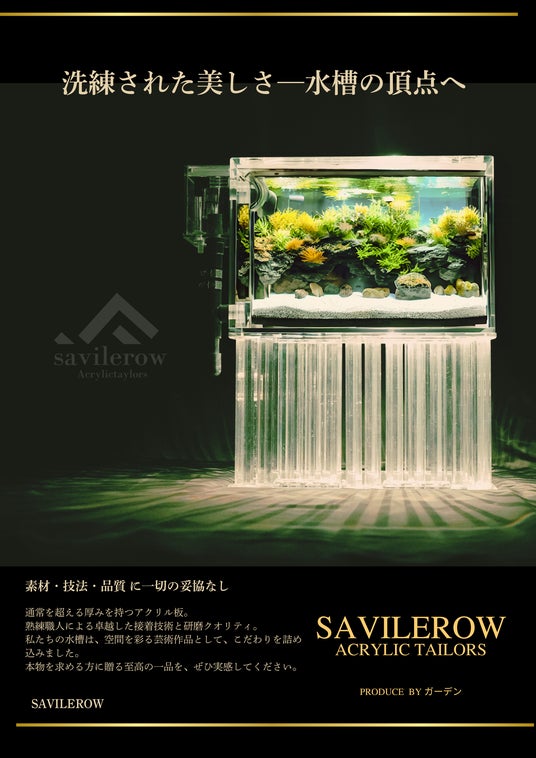 アクリル水槽の製造を手がける有限会社ガーデン(所在地:京都府亀岡市曽我部町犬飼弓田29番地1)は、2025年4月15日、完全オーダーメイドの高級アクリル水槽ブランド『SAVILEROW (サヴィルロウ)ACRYLICTAILORS 』を正式に発表いたしました。