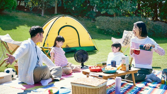 キャンプなどのコンセントがないシーンでも充電切れを気にせず涼しく快適に過ごせます。