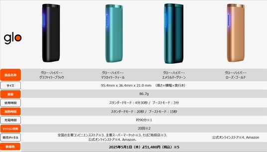 ブリティッシュ・アメリカン・タバコ・ジャパン合同会社(本社:東京都港区赤坂、社長:エマ・ディーン、以下「BATジャパン」)は、加熱式たばこデバイスglo(TM)のスタンダードモデル「glo(TM) HYPER」のメーカー希望小売価格を、5月1日(木)より現行の2,480円から1,480 円へ改定いたします。