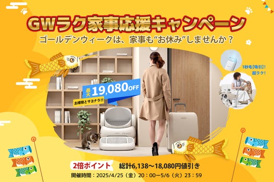 Neakasa(ネアカサ)は、2025年のゴールデンウィークに合わせて、家事の手間を軽減し、ペットとの暮らしをもっと快適にする「GWラク家事応援キャンペーン」を開催いたします。