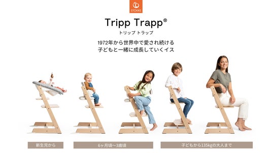 1972年にピーター・オプスヴィック氏によってデザインされたトリップ トラップ/Tripp Trapp(R)は、小さなお子さまでも一緒のテーブルにつき、家族と目を合わせて座らせるという北欧ならではコンセプトで、当時の子ども用家具に革命をもたらしました。奥行きと高さを調整できる座面と足乗せ板で、成長に合わせてちょうど良く座ることができ、アクセサリーを付け外しすることで新生児から大人になるまで使うことができます。また名入れをすることで、一生に一度、世界にひとつの、お子さまのためのイスに。