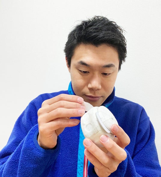 張り子のフエキくんは、フエキくんの頭を張り子で表現した首振りの人形です。張り子で作られた頭は、紙を不易糊工業株式会社のロングセラー商品である「どうぶつのり」で重ねて張って制作し、「どうぶつのり」と「フエキくん」の魅力を詰め込みました。頭を撫でると、ゆらゆらと揺れ動く、フエキくんをお楽しみください。