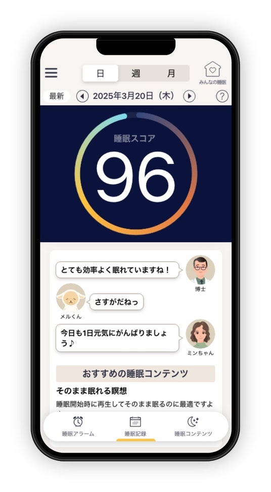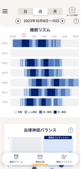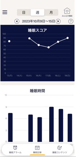 睡眠時間、寝つき時間、中途覚醒、睡眠効率の4項目に基づき100点満点でスコアを算出。このスコアと行動記録をもとに、眠りの特徴や改善アドバイスを提供します。解析結果を週次/月次単位で表示でき、睡眠の傾向や改善の実感が持ちやすくなります。