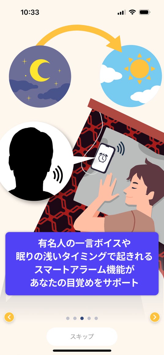 アラーム設定時刻より少し前の段階で眠りの浅いタイミングを検知してアラームを鳴らし、目覚めの良い朝をサポート。アラーム音は6種のオリジナルサウンドの他、メジャーリーガー 大谷翔平さん、プロサッカー選手 久保建英さん、プロバスケットボール選手 河村勇輝さん、声優 梶裕貴さんからのボイスが聞けるタレントボイス機能も導入しています。