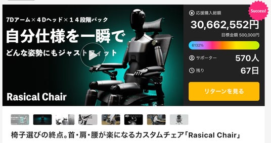 Rasical Japan(ラシカルジャパン)合同会社(本社:京都市下京区、代表社員:眞田 到) は、クラウドファンディングサイト「Makuake」にて開始した「Rasical Chair」が3,000万円を突破しました。