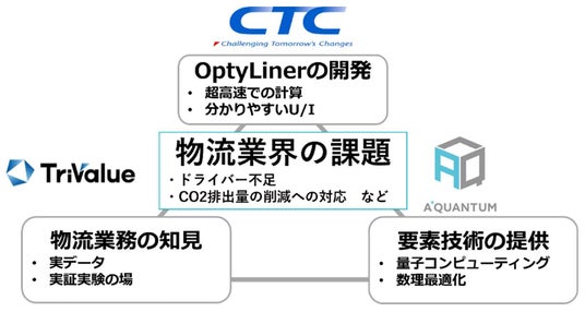 TriValue株式会社(代表取締役:高田 輝成、本社:埼玉県さいたま市)、伊藤忠テクノソリューションズ株式会社(代表取締役社長:新宮 達史、本社:東京都港区、略称:CTC)、株式会社エー・スター・クォンタム(代表取締役社長 兼 CEO:船橋 弘路、本社:東京都港区)の3社は、量子コンピューティングと数理最適化の技術を活用した配送ルート作成サービス「OptyLiner(オプティライナー)」を共同開発しました。3社の実証実験で、荷主の特性や地域情報を熟知した熟練職員が手作業で3時間かかっていた配送計画の作成時間を約95%削減し、熟練職員と同等以上の配送計画作成を10分以内で完了できることを確認しました。物流業界の課題である配送計画の作成の効率化やCO2削減などに貢献します。家具、建材、家電など配送先での作業が発生する製品を扱う企業を中心に展開し、作業者のスケジュールまで含めた高度な配送計画の策定を支援します。
