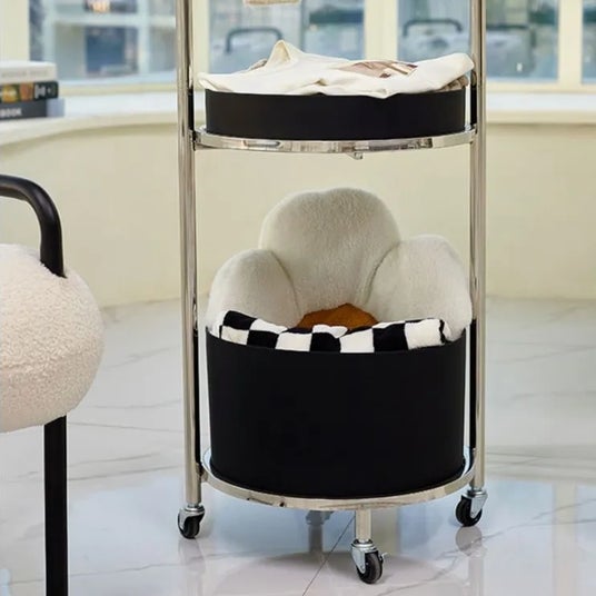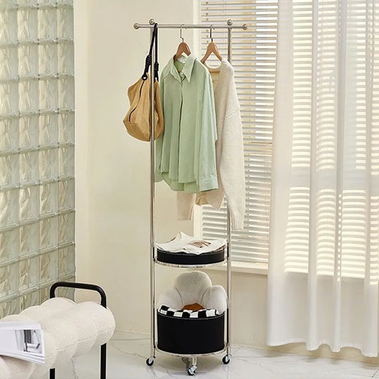 ラウンド型のフレームが空間にやわらかな印象を添えながら、ステンレスで洗練感あふれるハンガーラック。上部のラックには洋服を掛けることができ、下部は大容量の収納棚付きでバッグや小物の置き場にも最適。移動に便利なキャスターはストッパー付きで、使う場所でしっかりと固定できる優れものです。