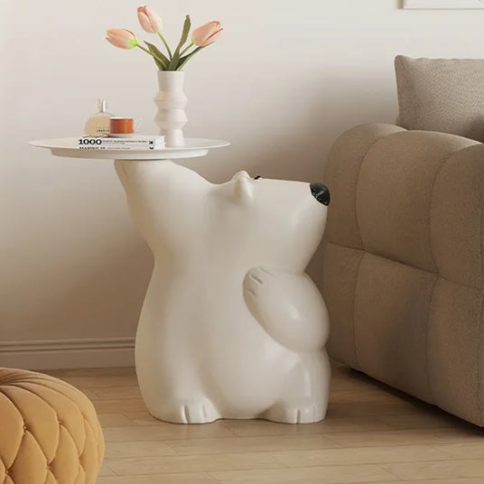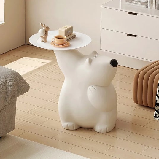 愛らしいシルエットが魅力のクマデザインのサイドテーブル。丸みを帯びたフォルムと角のない設計で、お子様のいるご家庭でも安心してお使いいただけます。コンパクトなサイズ感ながら、ちょっとした飲み物や小物を置くのにぴったり。リビングやベッドサイドにそっと置くだけで、空間に遊び心を添えるアクセントアイテムです。