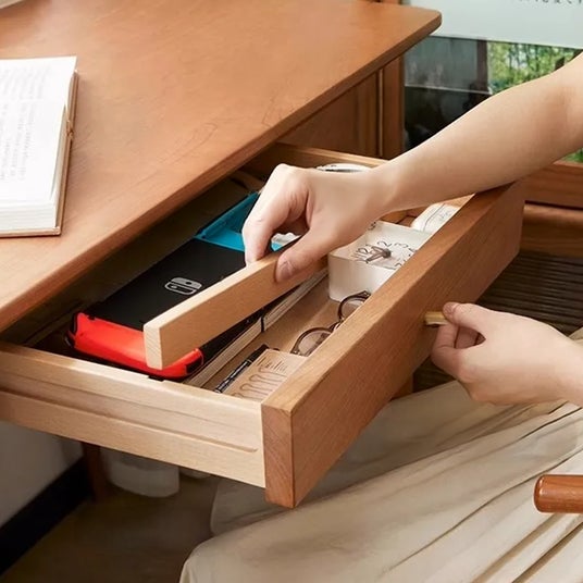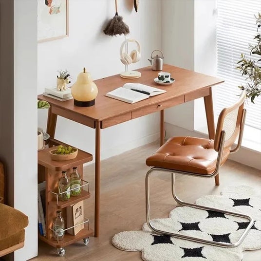 温もりあるチェリー材を使用した、コンパクトなワーキングデスク。丸みを帯びた角のデザインが優しい印象を与えつつ、安全性も確保しています。引き出し収納付きで、文具や小物をすっきりと整理可能です。上質な木目が空間に自然と溶け込み、自宅のワークスペースや学習机としてもおすすめ。