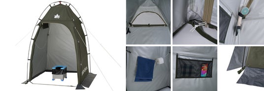 「neos パーソナルシェルター-BF」は、着替えやシャワー、簡易トイレなど、臨時のプライベート空間に役立つシェルター。上部に大型のメッシュ窓を備えており、採光と換気の両方をサポート。フルクローズ仕様で、フックで固定するだけで内側からロックが可能。シャワーヘッド対応のフックやタオルを吊り下げられるロープ、メッシュポケットのほか、マッドスカートを全面に装備しており、虫の侵入や盗撮も防止。災害時はもちろん、キャンプやビーチ、釣りなど、普段のアウトドアシーンでも活躍。
