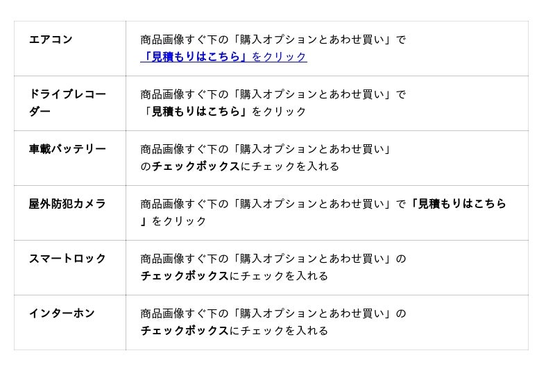 現在、「となりの執事さん」が対応するAmazon上の同時購入サービスの対象カテゴリーは「エアコン」「ドライブレコーダー」「車載バッテリー」「屋外防犯カメラ」「スマートロック」「インターホン」となっています。それぞれの対象商品ページにて、下記のボタンをクリックすることで「取付サービス」を簡単にカートに追加可能です。