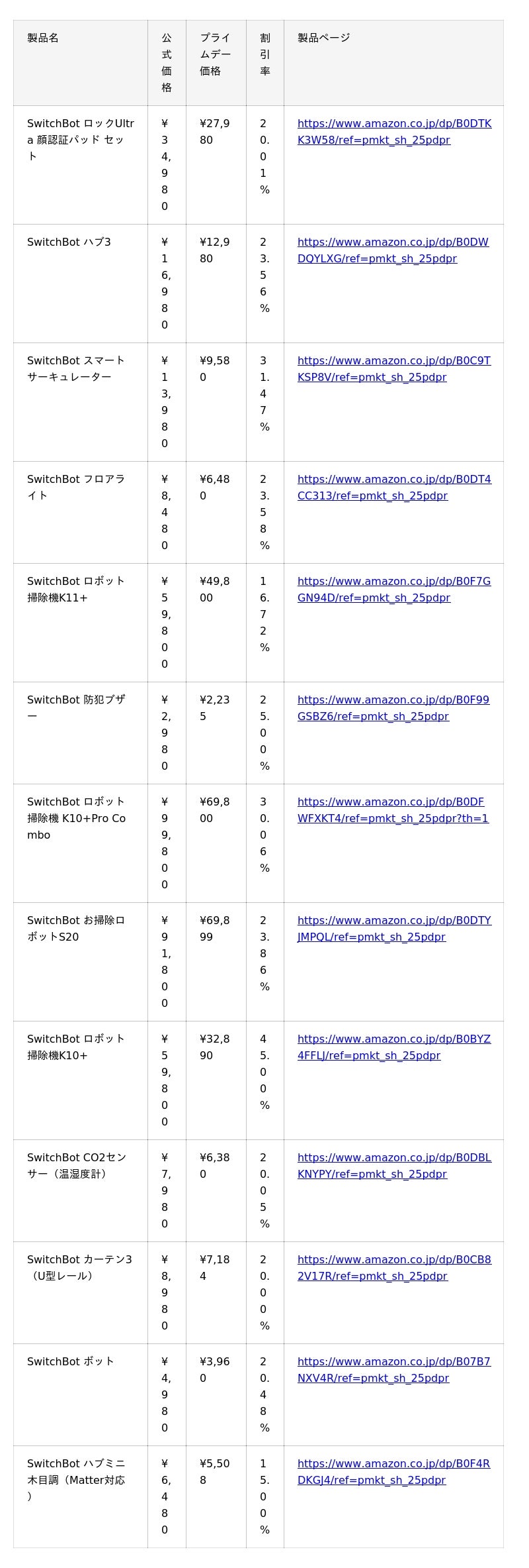 IoT・スマートホーム事業を手掛ける「IoTデバイスNo.1ブランド(2022年、家電Biz調べ)」のSWITCHBOT株式会社(本社 : 東京都渋谷区)は、本日よりいよいよAmazonプライムデーの本セールを開始。各種ロボット掃除機をはじめ新製品や大人気製品などほぼすべての製品を対象に、最大50%の割引を実施いたします。なかには史上最安値で参戦するアイテムも。開催期間は2025年7月11日(金)0時~7月14日(月)23時59分まで。詳細は本文をご覧ください。