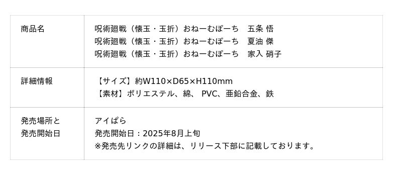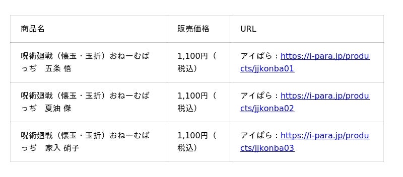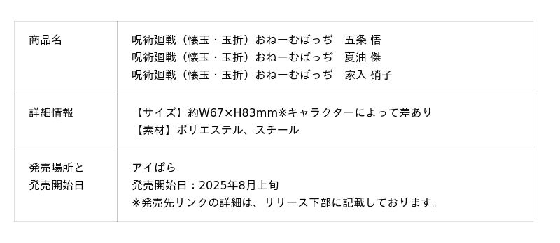 オリジナルグッズの企画・製作を手がけるアイグッズ株式会社(本社:東京都渋谷区)は、『呪術廻戦』「懐玉・玉折」のオリジナルグッズを2025年8月上旬より発売開始いたしました。今回の新商品は、「おねーむばっぢ」「おねーむぽーち」の2種類。販売は、当社のECサイト「アイぱら」にて展開予定です。