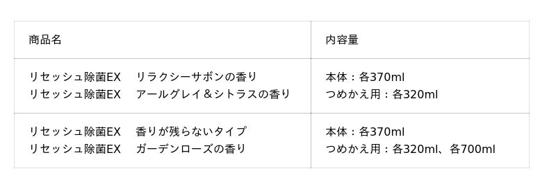 そこで今回、「リセッシュ除菌EX」は、トレンド感あふれる2つの新香調を加え、全4品のパッケージを刷新します。「リラクシーサボンの香り」は香水に使われるムスクとアンバーを贅沢*3 にブレンドした、やさしく包み込むような石けんの香りです。「アールグレイ&シトラスの香り」は、3種のシトラスとトレンドのティー系の香りが調和した爽やかな香りです。