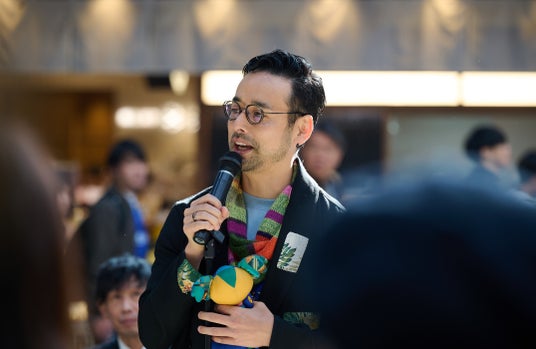 スピーチをするタレント・手芸家・デザイナーの洋輔さん