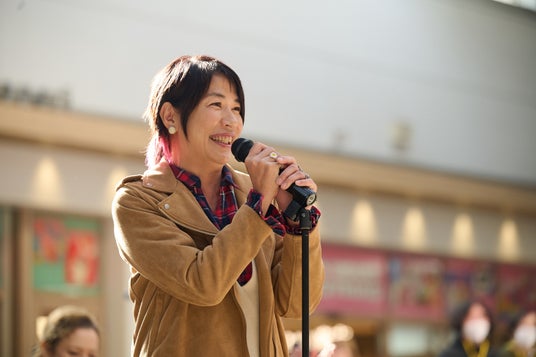 スピーチをするタレント・キルト作家のキャシー中島さん