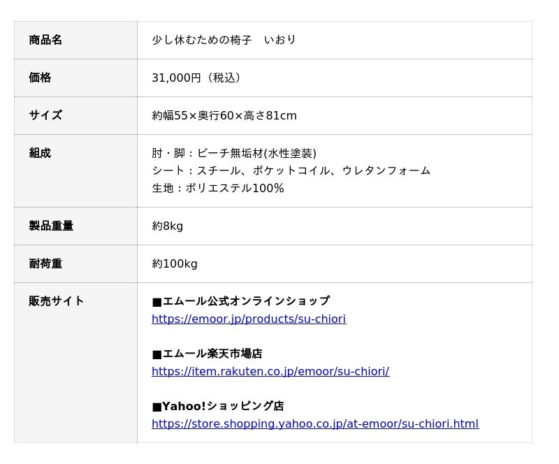 「寝る、座る、たたむ」に専門性を持った健康家具ブランドEMOORを展開する株式会社エムール(東京都立川市:代表取締役 高橋 幸司)は、2025年12月24日より「少し休むための椅子~いおり~(以下、いおり)」の販売を開始しました。人間工学に基づいた中間設計で休息から軽作業までを快適にサポートします。