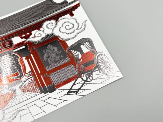 箔押し加工とは熱と圧力によって、紙に箔を圧着させる技法です。浮世絵の木版画を刷り上げていくように、1枚ずつ金属板をつくり、2度3度と箔を重ねて絵柄を完成させていきます。