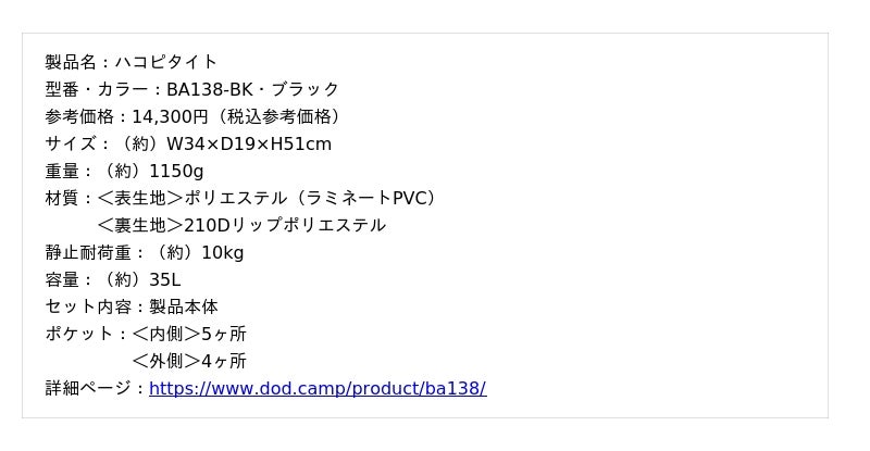 ビーズ株式会社(本社:大阪府東大阪市、代表取締役社長:大上響)が展開するアウトドアブランドの「DOD」は、通学カバンに適した35Lの箱型バックパック「ハコピタイト」を2026年1月9日より発売しました。